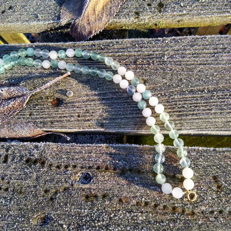 Zartgrüner Fluorit bringt sinnliche Wahrnehmung und Achtsamkeit und weiße Jade sanftes Glück.