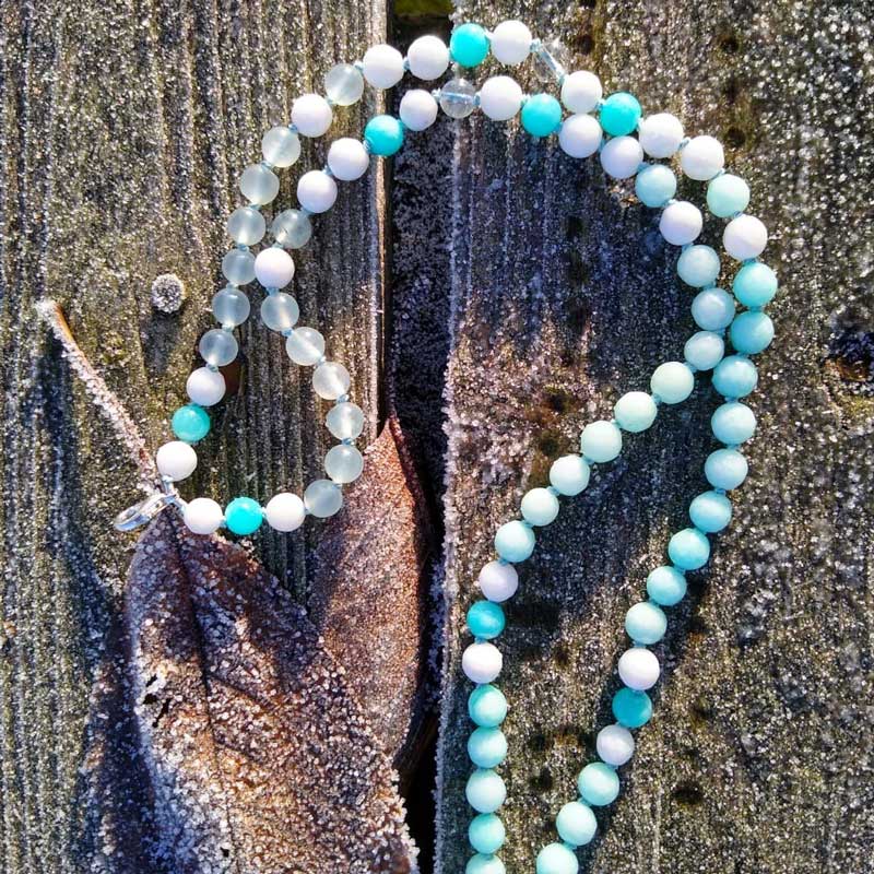 Diese Mala ist ein Ensemble aus Florit, Amazonit, weißer Jade & Bergkristall.