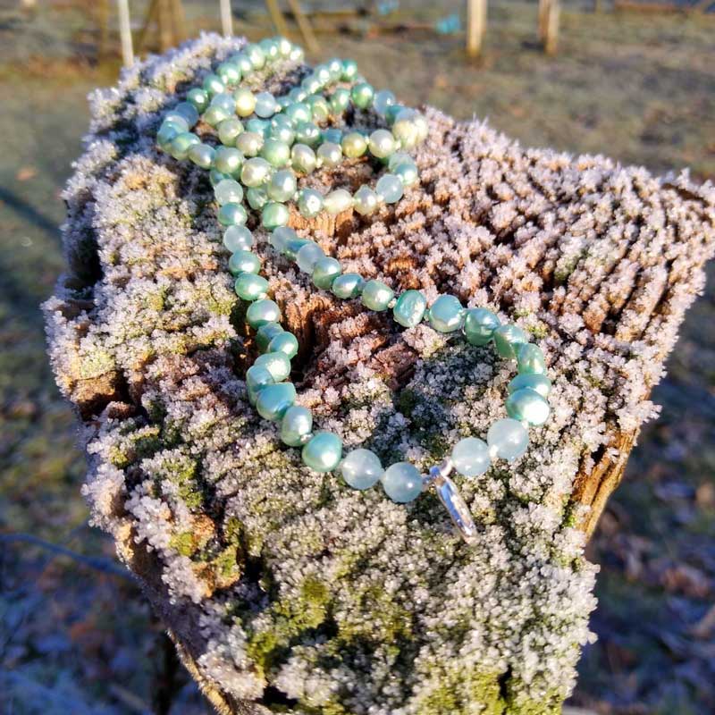 Diese Mala besteht aus Süßwasserperlen in mintschiller Optik und weißer Jade.